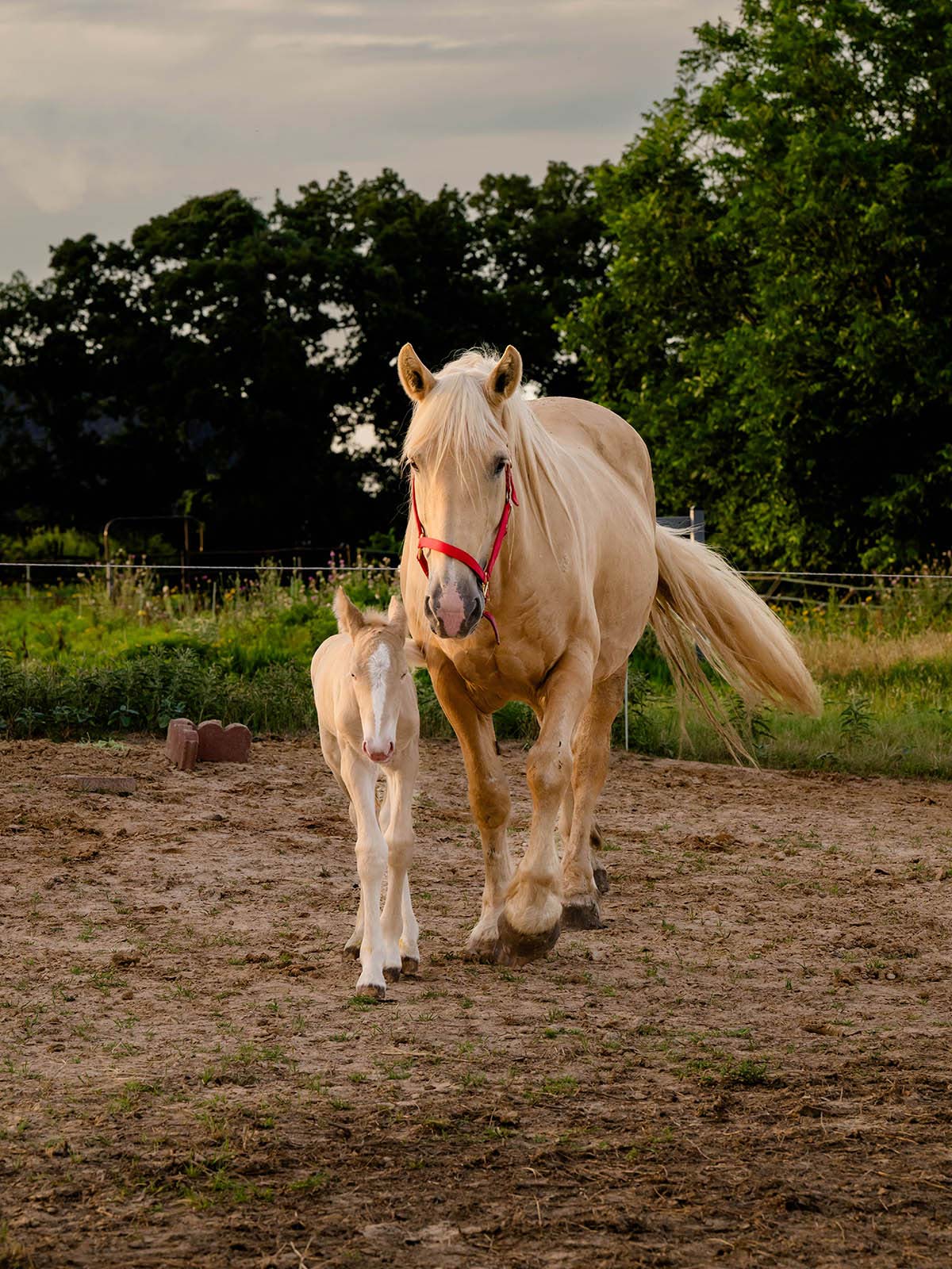 As their name implies, American cream draft horses are cream colored, but they actually come in two shades. Darker American creams have brown eyes, and lighter-colored horses have amber eyes and pink skin.