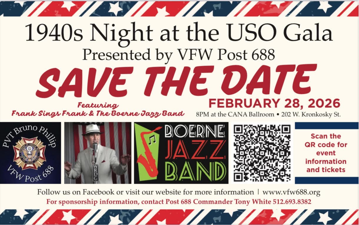 We are hosting a "Night at the 1940s USO" gala event! Come join us for dinner and dancing with entertainment by Frank Sings Frank and the Boerne Jazz Band.