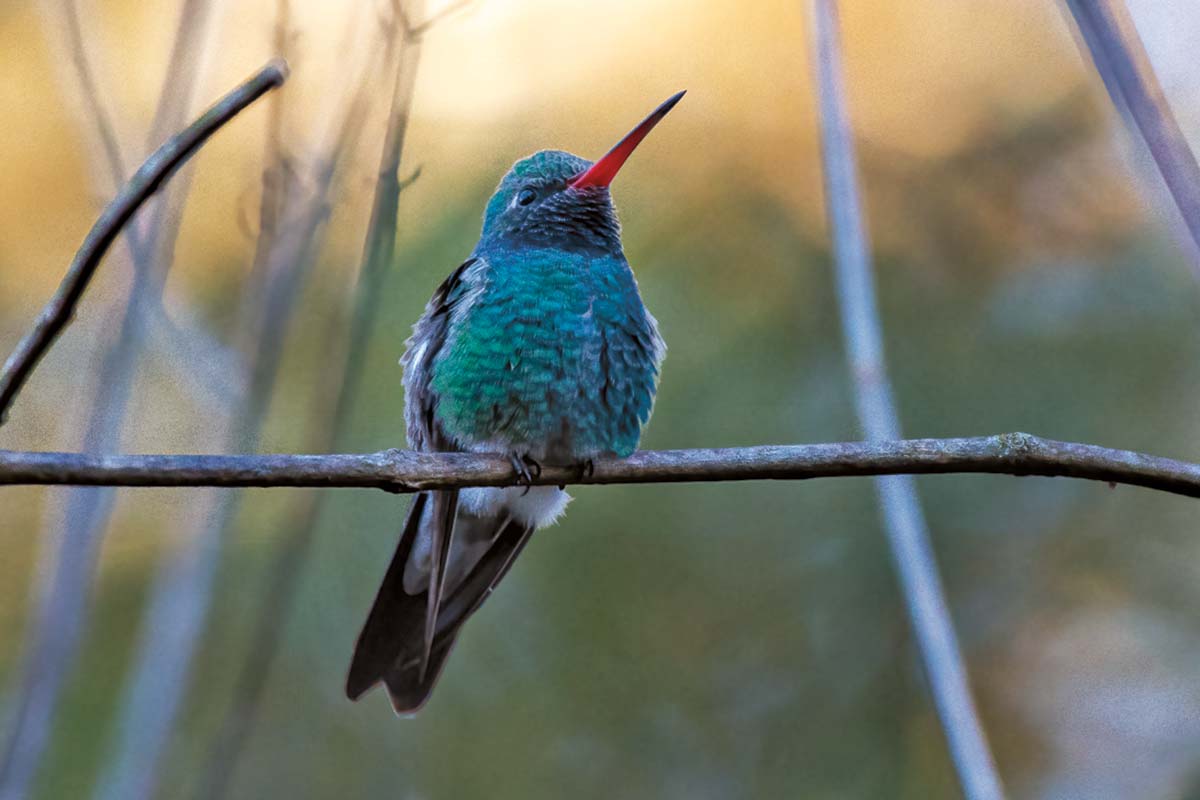 A male broad-billed hummingbird, with its black-tipped, long red bill.