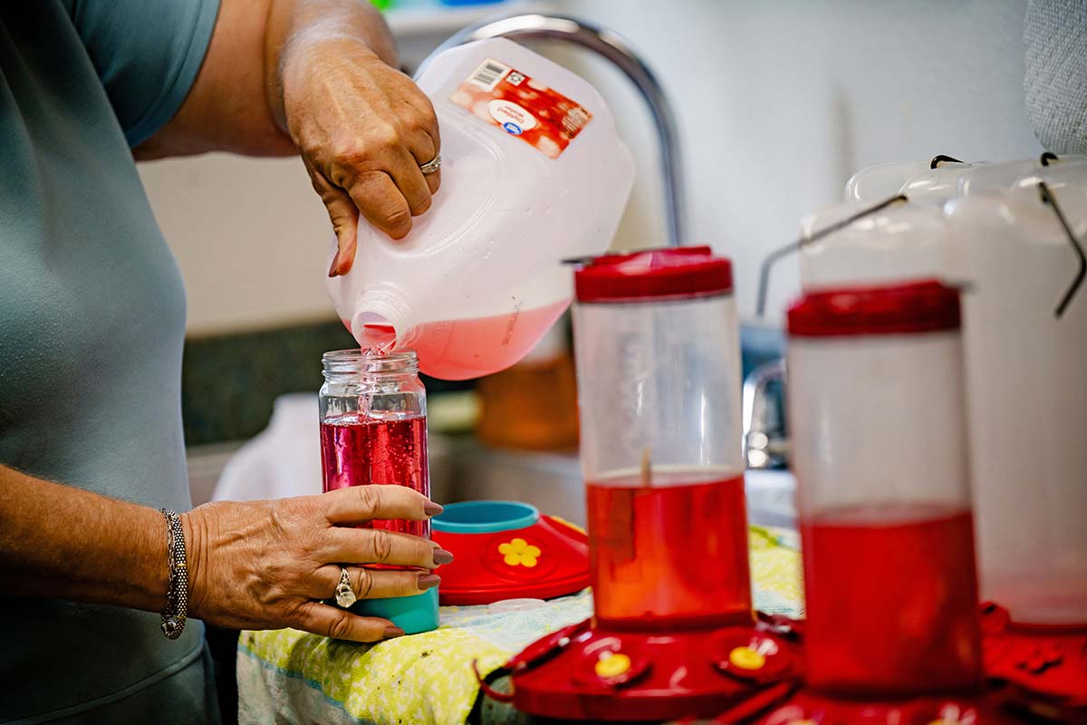 Cathy Brown refills hummingbird feeders at their ranch. Each season, the Browns use around 1,500 pounds of sugar to make nectar for their feathered residents.