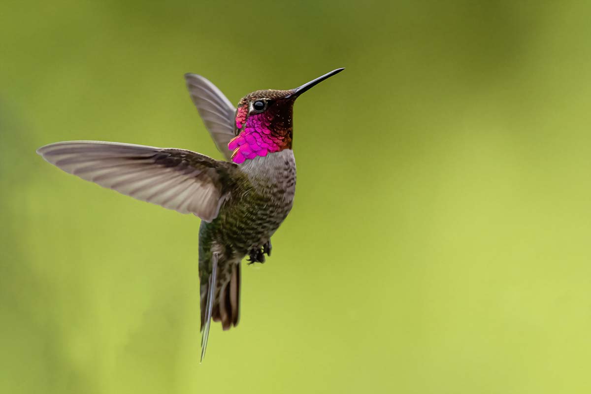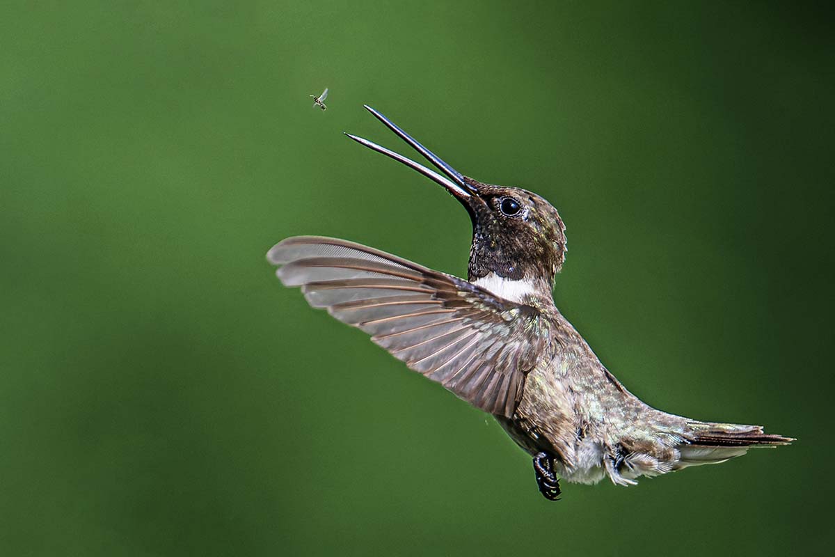 The next time a hummingbird streaks past, imagine you’ve been buzzed by a miniature fighter jet. That’s how fast nature’s smallest bird can fly relative to its size. In flight, a hummingbird beats its wings in a figure eight up to 40 times or more per second. This rapid motion enables it to spin, hover, and fly backward and upside down at speeds of 30 mph or more.
