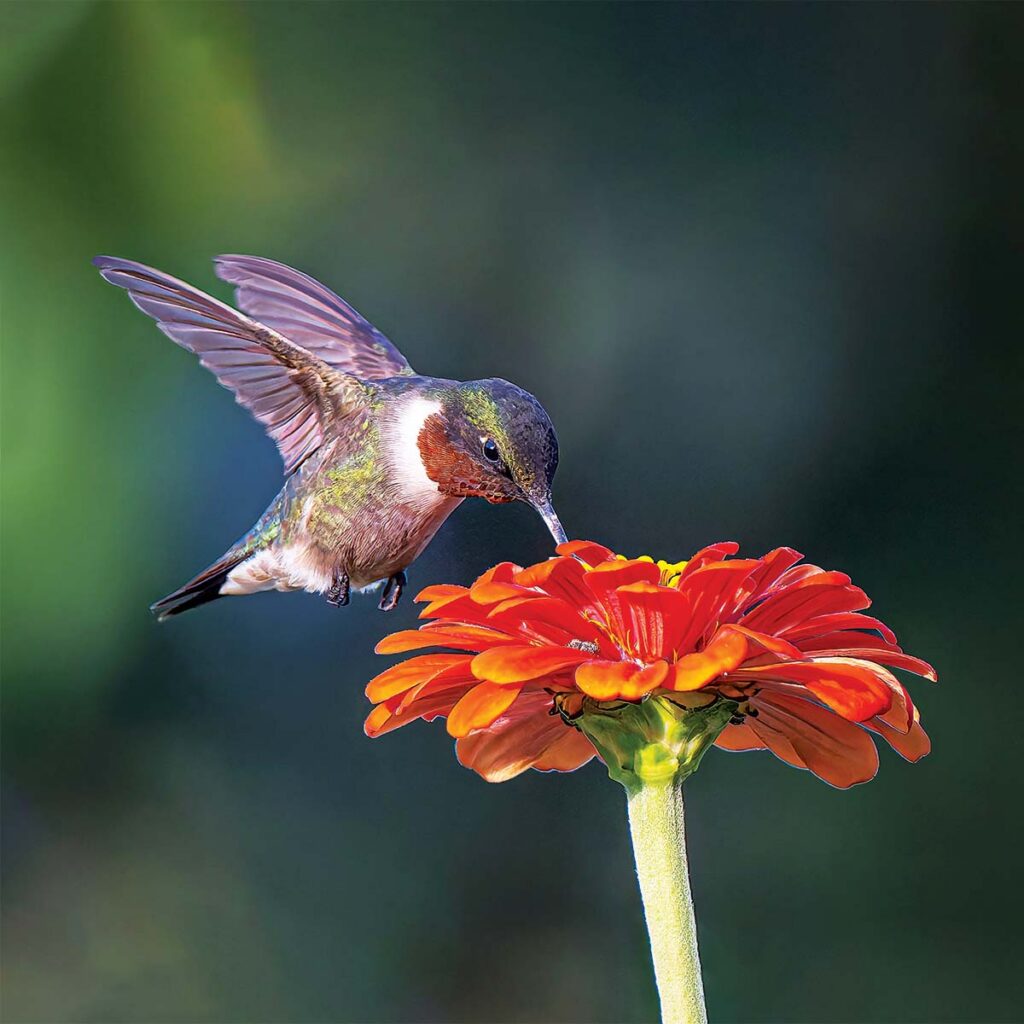 A male ruby-throated hummingbird fuels up on a zinnia bloom.