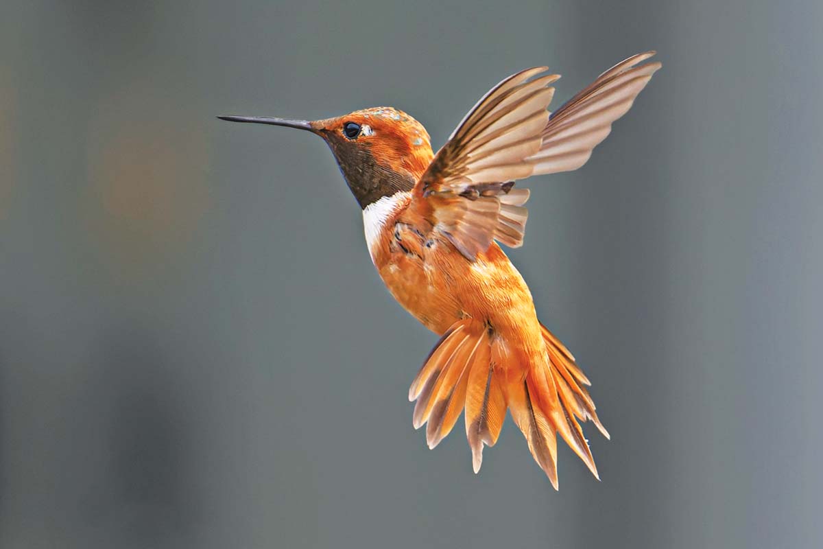 To fuel such a high metabolism, a hummingbird, which can weigh 2–20 grams, slurps up nectar that’s at least double its weight every day. One fill-up lasts 20 minutes, then it’s off to find more flowers and insects or return to a feeder—dining territory that a hummer will fiercely defend, even remembering which blooms it has already drained (and pollinated).