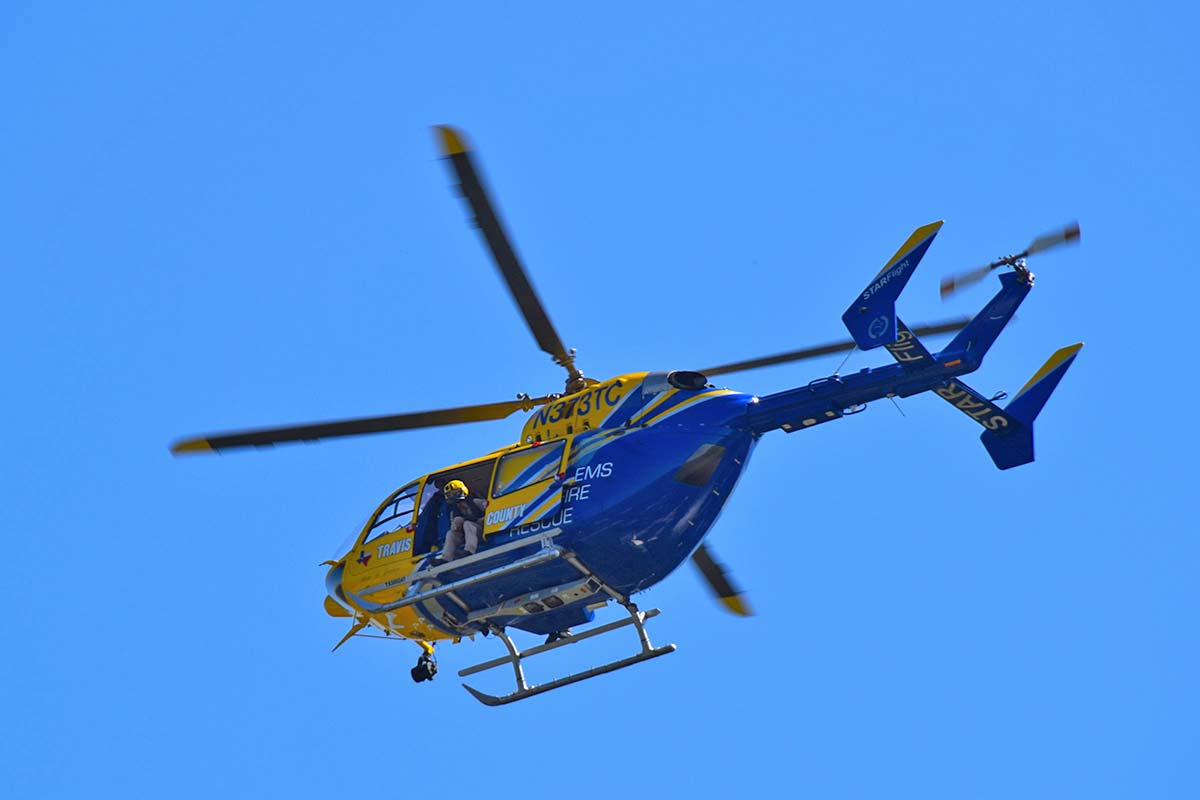 Judy Madden, Pedernales EC: “The helicopter pilot looks for a spot to land to assist with an auto accident. One of the emergency medical services crew members sticks their head out of the open door.”