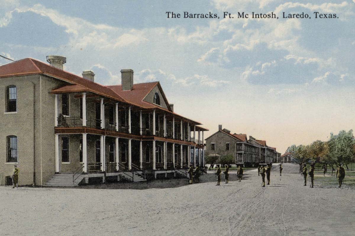 A colorized postcard from the early 1900s shows barracks at Fort McIntosh in Laredo.
