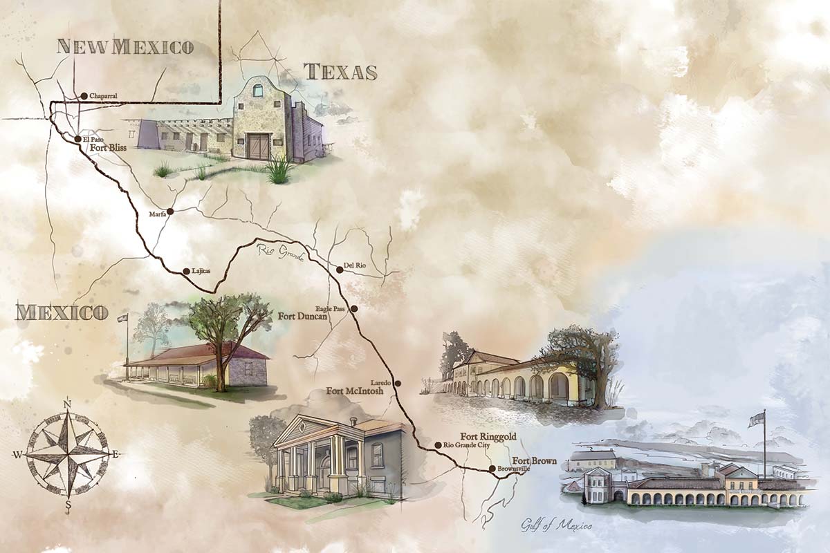 The border forts had much in common, each named for veterans of the Mexican-American War, fought immediately following Texas statehood. At Rio Grande crossings, most about 100 miles apart, each fort shifted locations several times before being rebuilt as permanent posts after the Civil War.