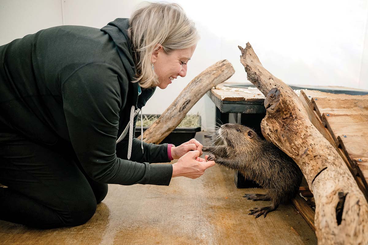 Brady plays with Walter, a nutria from Houston. Because nutria are an invasive species, he won’t be released into the wild.