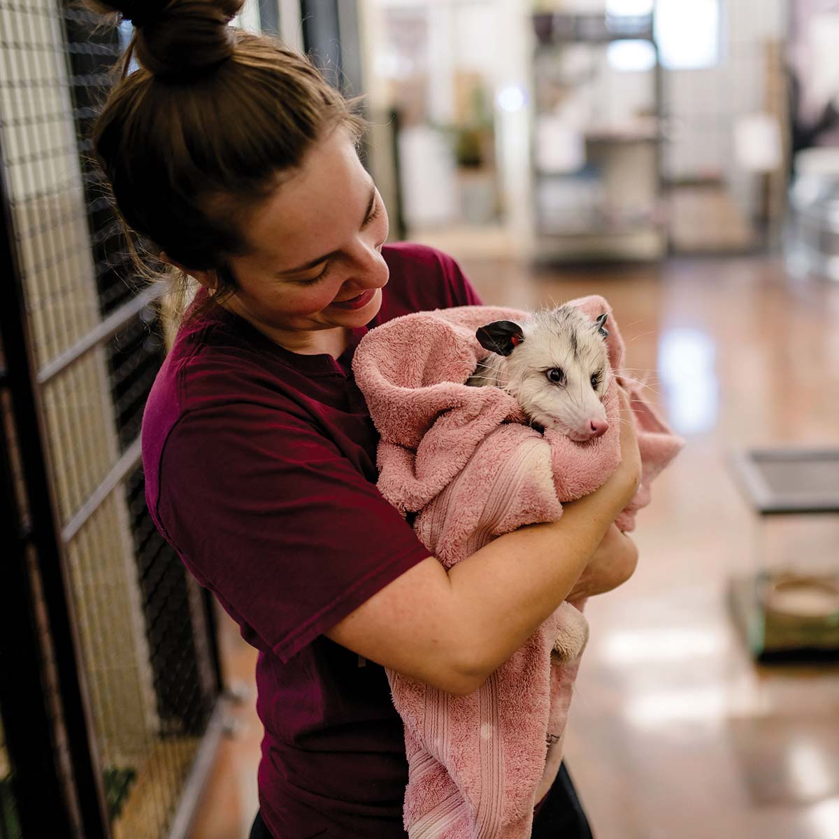 “The first thing someone should consider if a wild animal needs help is personal safety,” Caswell says. “Wildlife can carry zoonotic diseases and may pose a risk of injury through bites, kicks and scratches. Some general signs to look for are parasites, animals covered in bugs and symptoms of dehydration—dull/dry fur, wrinkled skin and emaciation. If a baby animal has been picked up by a dog or cat, we always recommend bringing it [baby animal] in for antibiotics.”