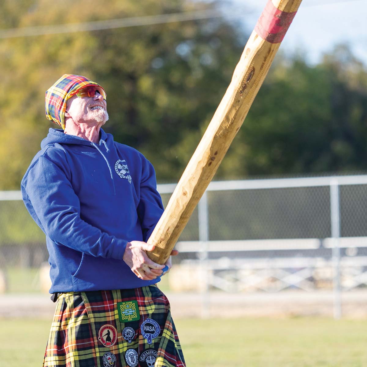 One of the oldest and largest gatherings in Texas takes place every November in Salado, between Waco and Austin. The competitions tend to involve heaving heavy objects, including something called a caber, which looks very much like a power pole. Contestants hold the caber, which can be up to 22 feet long and 200 pounds, upright from the bottom and flip it forward. The goal is for it to land upright then fall forward.