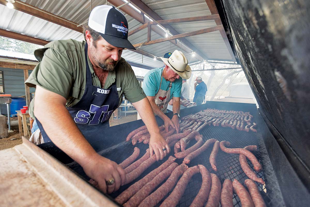 Half a dozen apron-clad men gather around a 40-foot smoke pit behind Zion Lutheran Church in Walburg, checking on the homemade sausage sizzling on its metal racks.