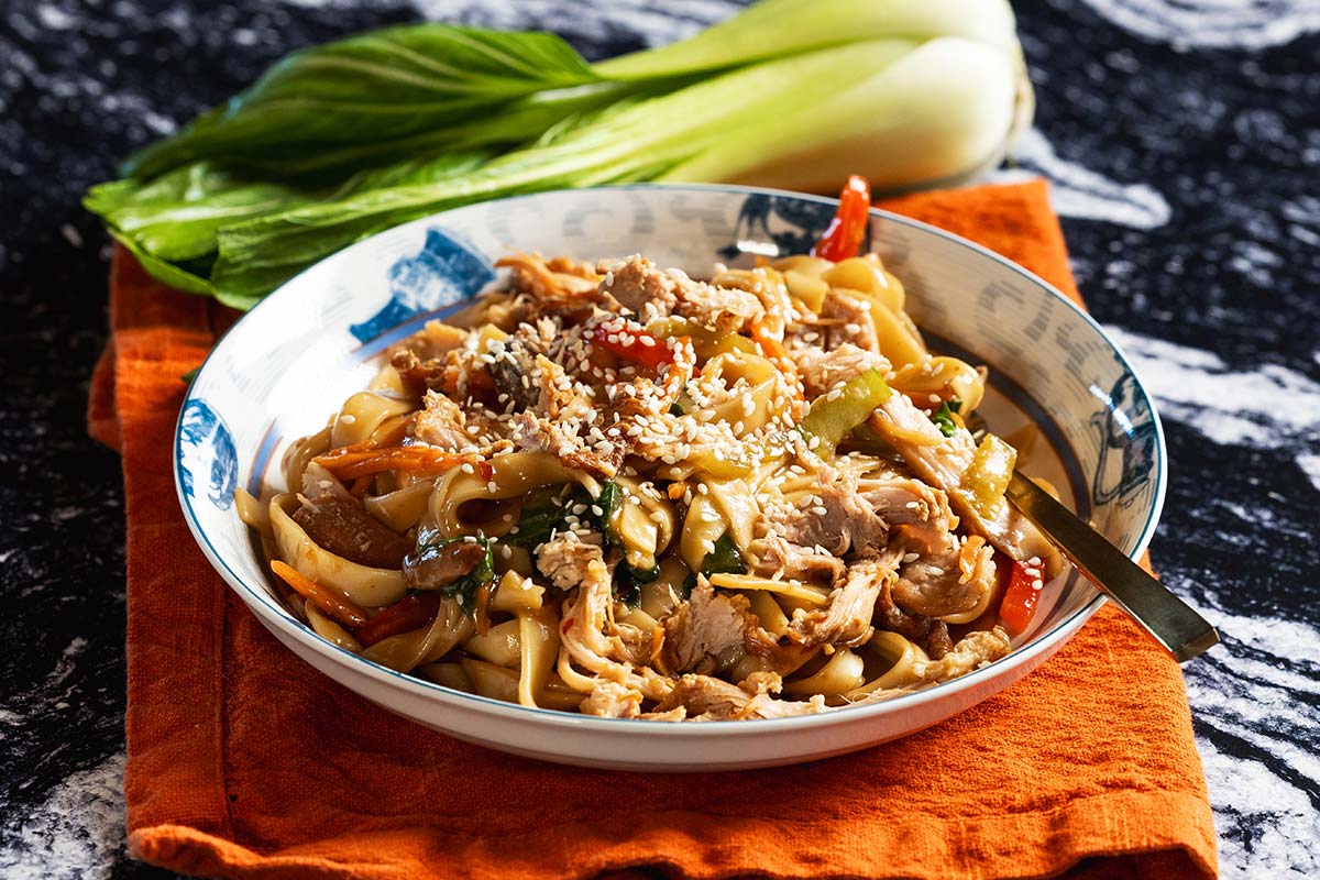 6. Stir in cooked noodles. Serve warm, topped with carrots and cucumbers. Garnish with sesame seeds, cilantro and lime wedges.