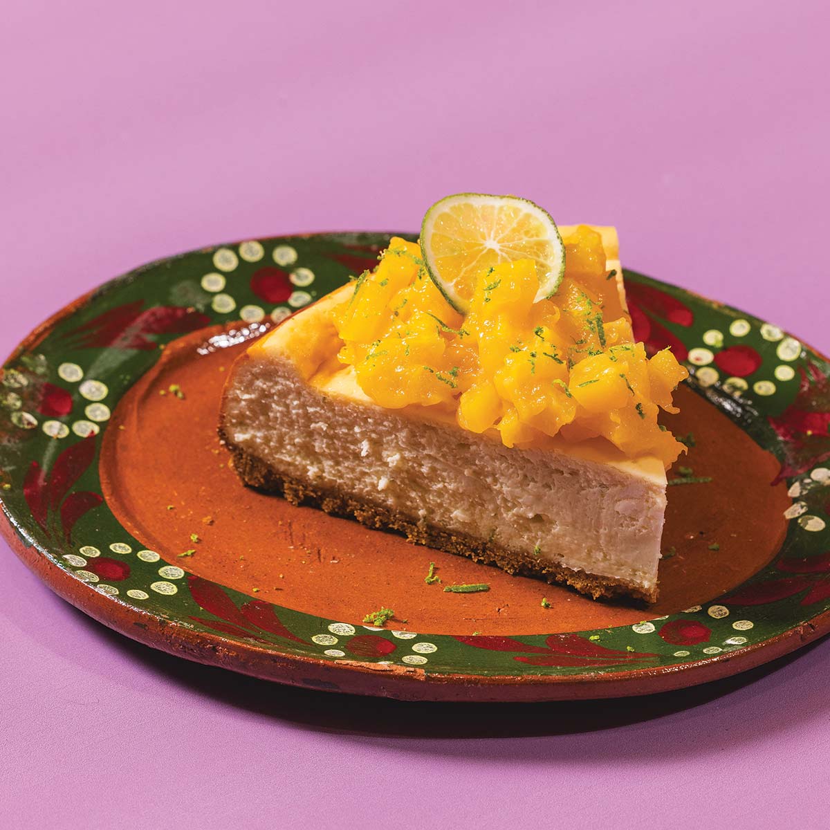 7. Reduce heat to medium. Add mango to pan, gently stirring to coat. Cook 10 minutes or until mango is lightly browned, stirring frequently. Allow to cool and serve cheesecake topped with mangoes.