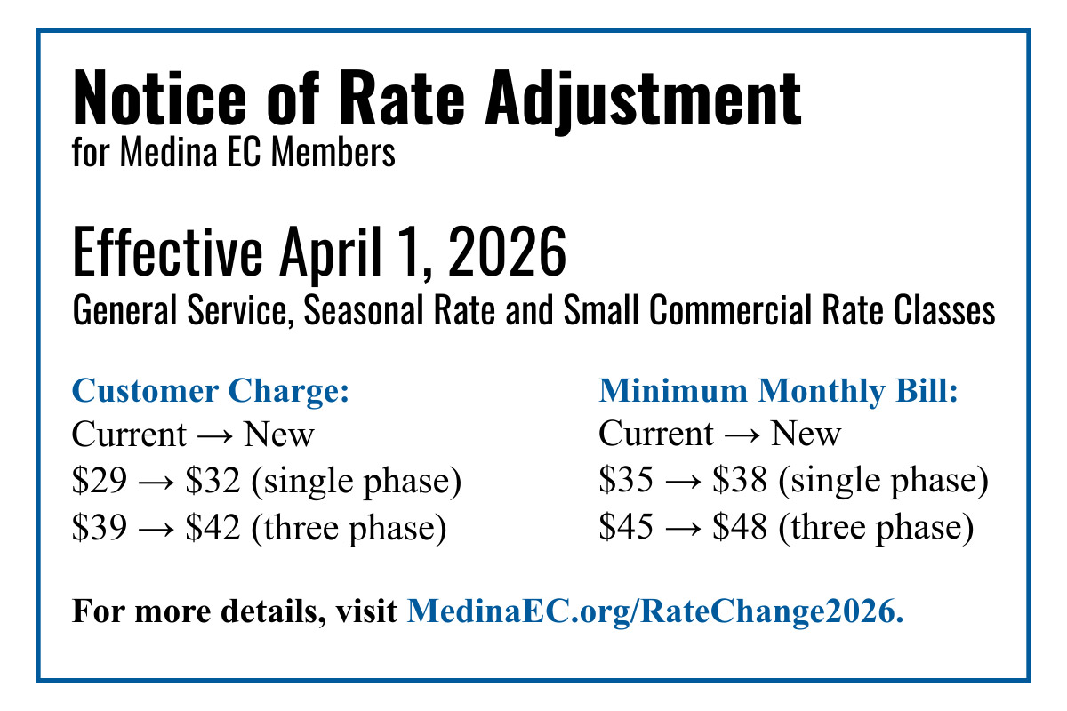 At Medina Electric Cooperative, we know that rate changes impact your household budget, and the board does not make these decisions lightly. As a member-owned, not-for-profit utility, our goal isn’t to make a profit for investors, it’s to provide you with safe, reliable power at the lowest possible cost.