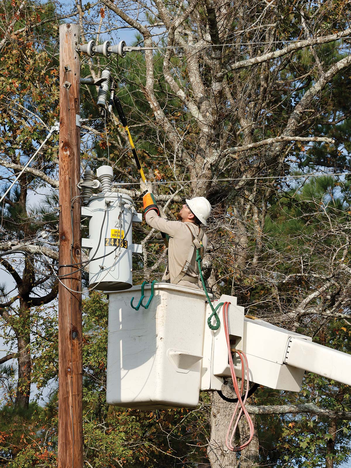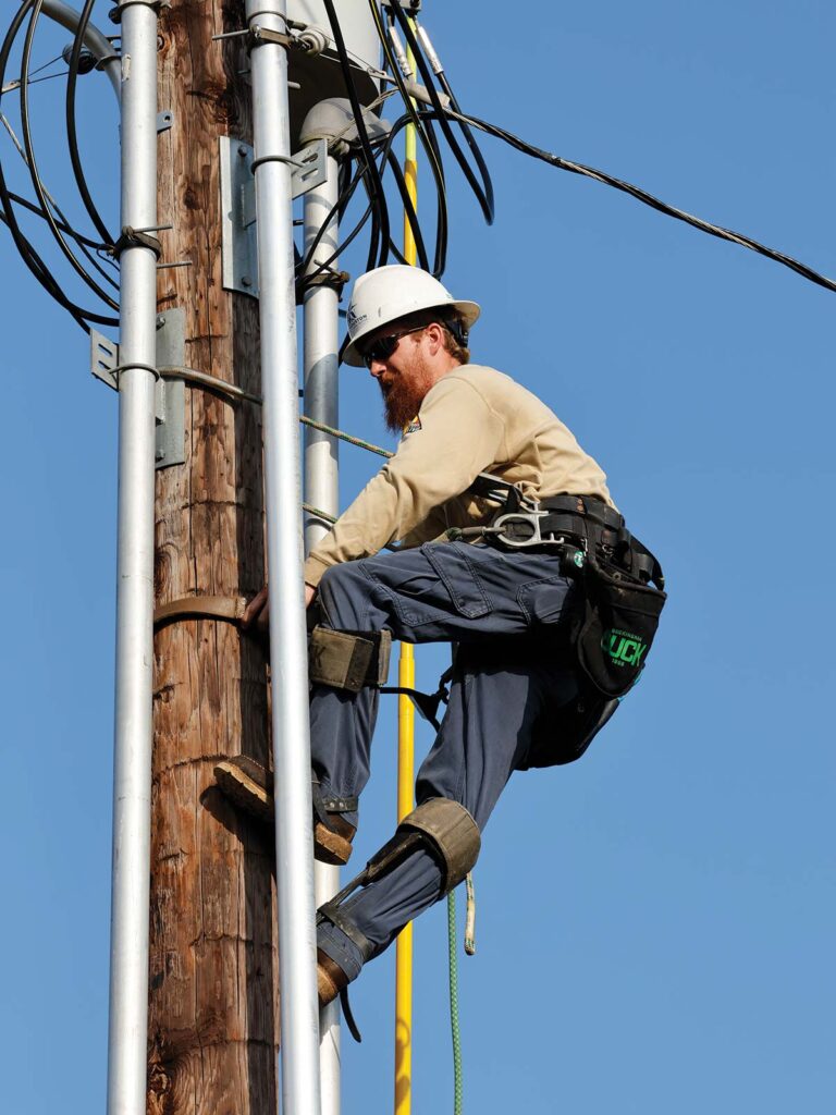 A.J. Hester, a Livingston lineman, climbs a pole to adjust the voltage setting on a pole-mounted transformer.
