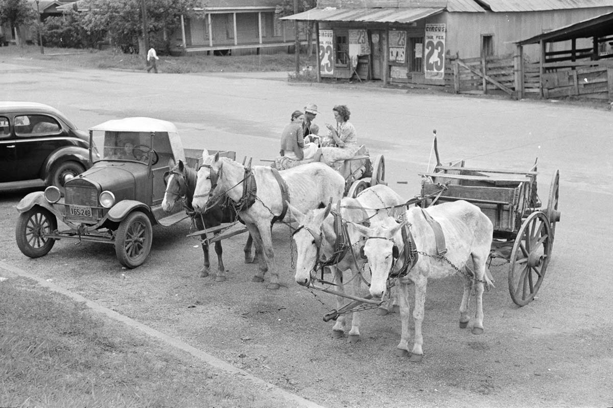 Farmers’ vehicles parked near the county courthouse, cars and wagons alike.