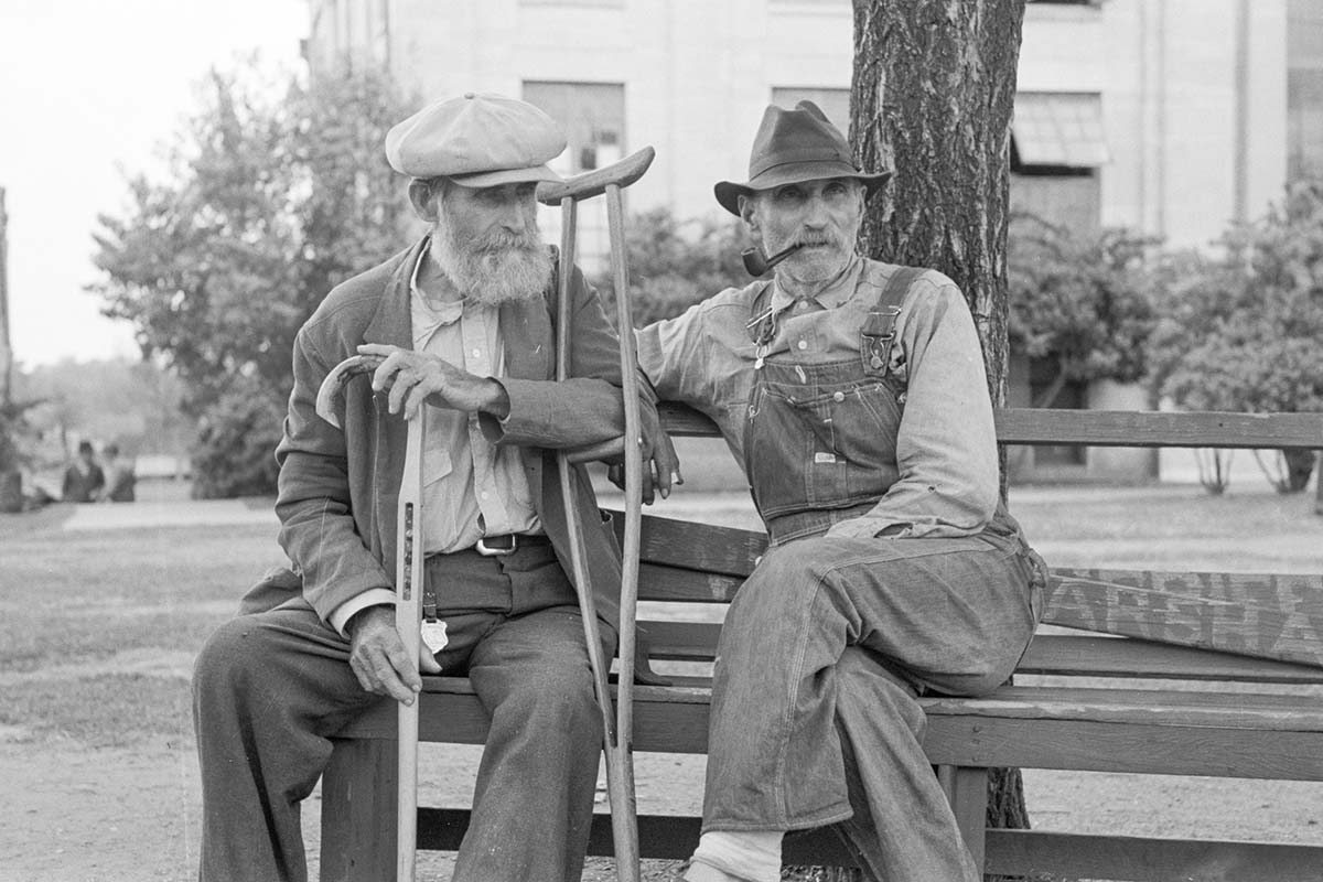 Old-timers swap stories on a bench on the courthouse square.