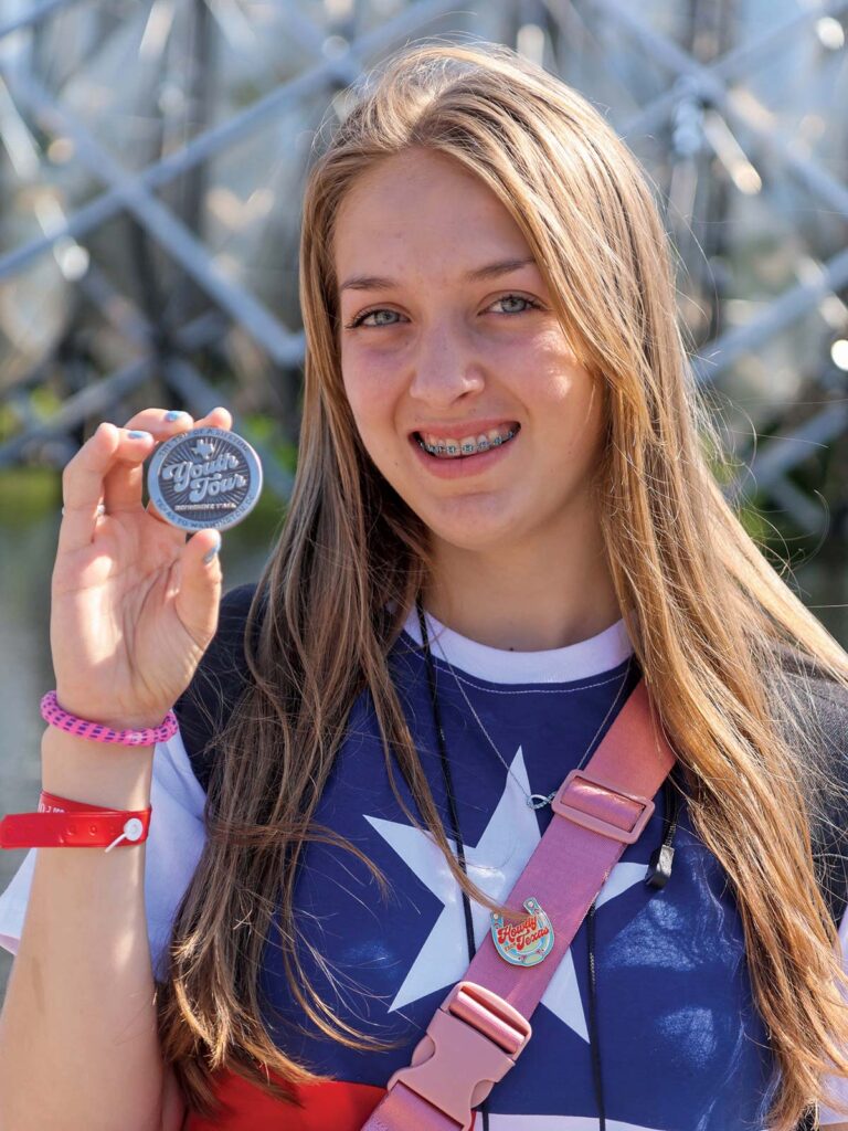 Ella Robbins from Heart of Texas EC holds up her Youth Tour challenge coin, which students were awarded for going above and beyond.