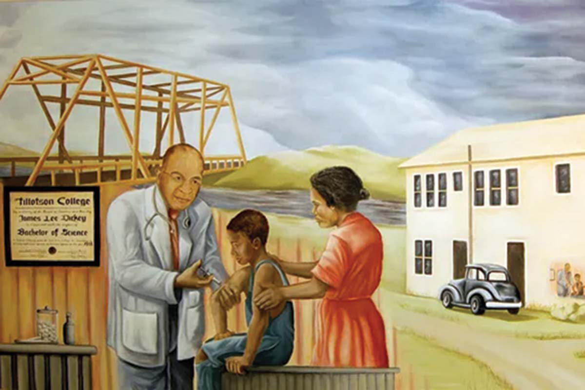 A mural created by a collective of artists depicts Dr. James Lee Dickey administering a vaccine during a typhoid outbreak in the early 1930s.