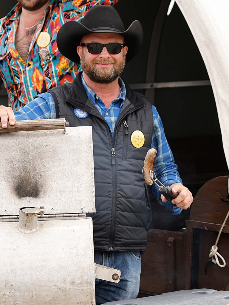 Modern conveniences such as a mobile charcoal grill allow for the Spanish Trail riders to enjoy cooked foods throughout the day.