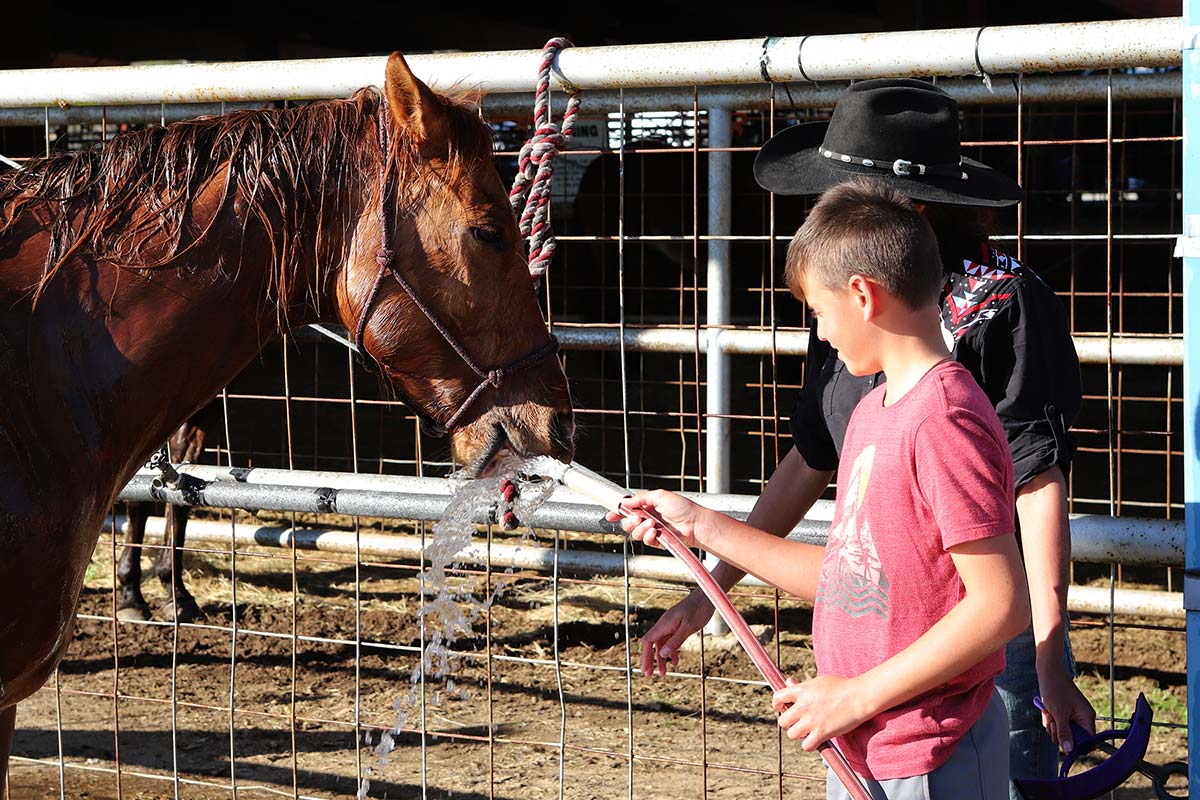 A boy waters a horse following a day of trail riding. Riders must water, feed and care for the horses to make the journey.