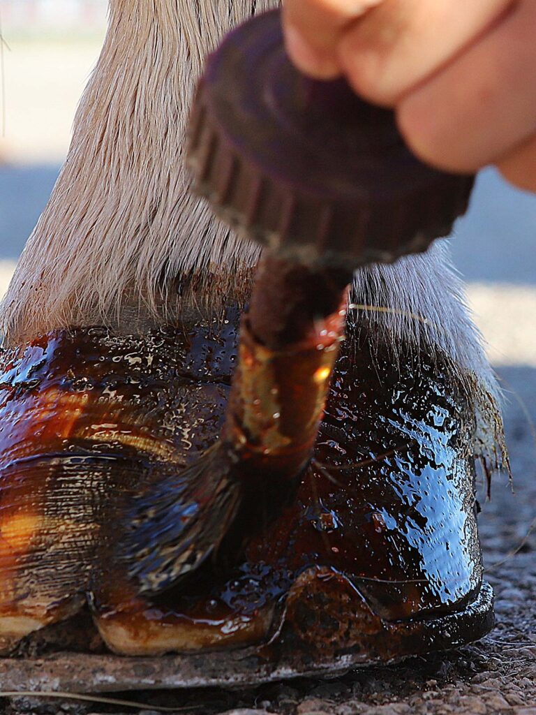 Almost like a pedicure, a rider applies hoof polish during an overnight stop. The polish protects the hooves and enhances a horse’s appearance.