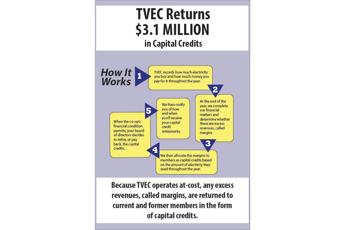 After reviewing the co-op’s financial condition this year, the TVEC board of directors approved the retirement of capital credits in the amount of $3.1 million. This distribution to more than 72,000 current and former members of TVEC represents the outstanding patronage capital for the years 1988, and one percent of all other allocated, but unretired capital credits. Current members will be issued a bill credit in the month of December and former members will be mailed a check for this patronage.