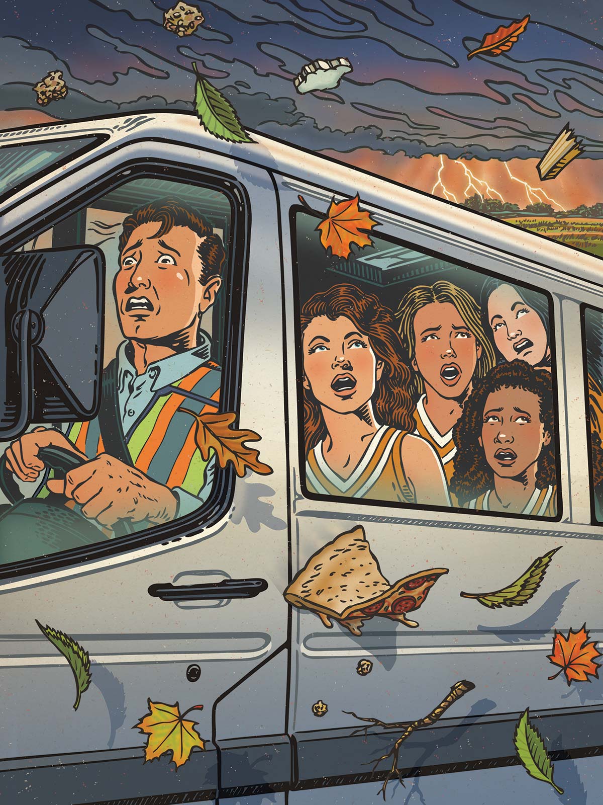 In the rearview mirror, I saw the cheerleaders leaning toward a window, looking up at the sky, where, yes, a suspicious-looking cloud was hanging low and ominous over the flat farmland.