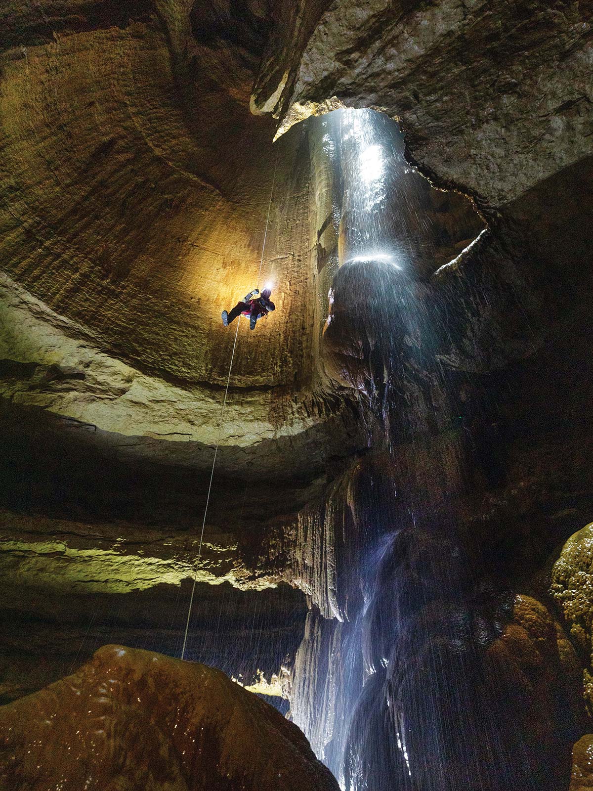 Austin cave expert Ethan Perrine descends a rope alongside a 70-foot underground waterfall in a cave below a West Texas cow pasture.