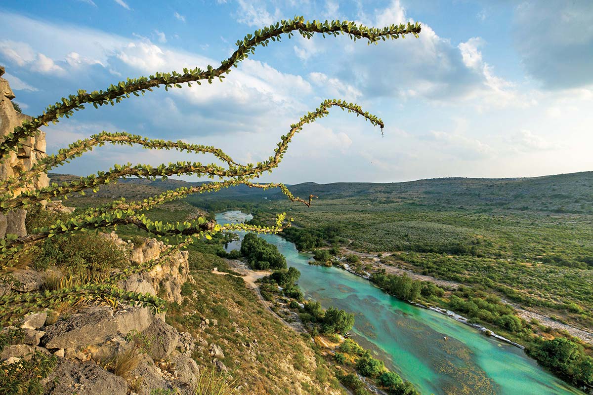 Ocotillo reaches out from a bluff overlooking Devils River State Natural Area, north of Del Rio. The river, part of the Rio Grande watershed in Southwest Texas, is one of the most pristine in Texas.