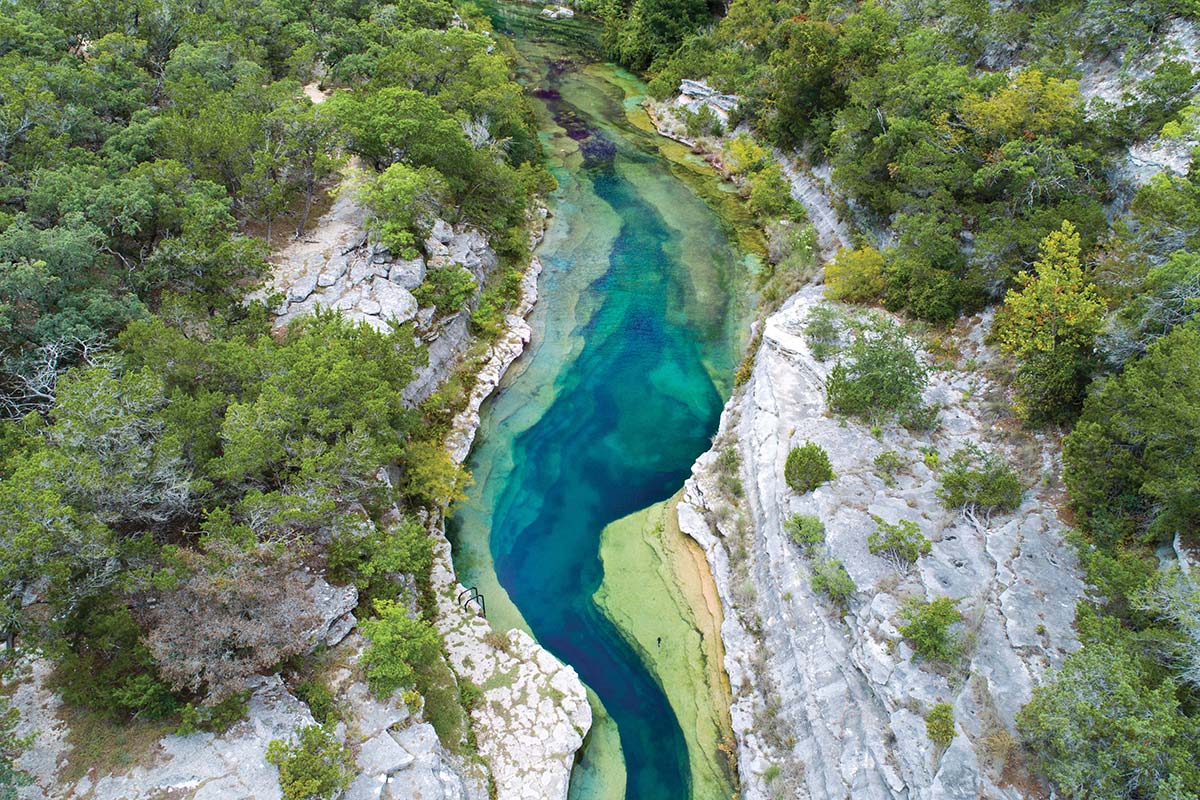 On the other hand, anybody can paddle and swim just west of the Hill Country. Here, the crystal-clear Nueces River is nothing like the muddy flows that empty into the Gulf of Mexico. You’ll find swimming pool-clear water in Lake Nueces as well as upstream, in a swimming hole in the town of Camp Wood named for its depth in feet, Quince (15).